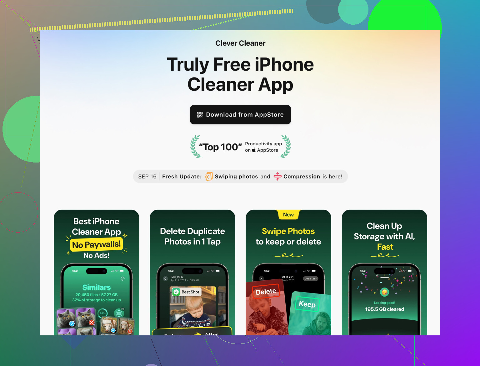 smart tools to clean up and organize iPhone storageThat page basically outlines how the Clever Cleaner App for iPhone works as a storage optimizer: it scans your gallery for duplicates, groups similar images, surfaces the largest videos, and gives you a review step before anything is deleted. It is more of a guided cleanup assistant than a “one tap magic booster.”